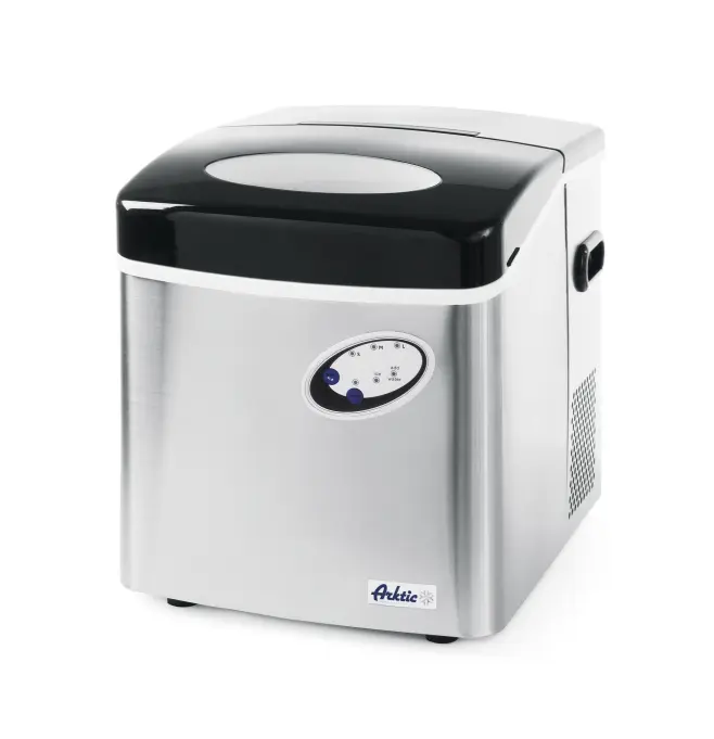 Ismaskin bordsmodell. Kapacitet 15 kg per dag. Buffertlager på 4,5 kg. 9 kuber per cykel. Ingen fast vattenanslutning. 3 olika iskubstorlekar.