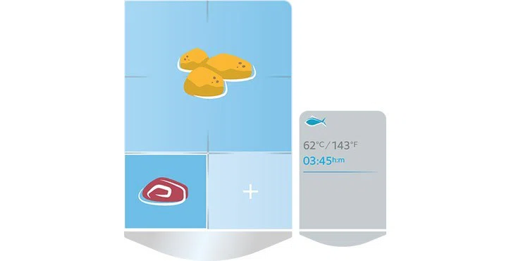 På displayen föreslår den intelligenta användarguiden vilka rätter som kan tillagas tillsammans. Den optimala användningen visas också, till exempel baserat på temperaturen. Och iZoneControl berättar vilka rätter som kan tillagas på vilken plats. Detta sparar tid och energi.
