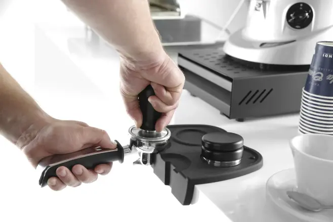 Lämplig till de flesta portafilter. Tamper i rostfritt stål med fjäder. Svart handtag i aluminium. Tål ej diskmaskin.