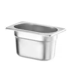 GN kantin 1/9 i rostfritt 18/8 stål - mått 176x108, två olika djup 65 eller 100. Kantinerna är tillverkade enligt Europeisk standard SS-EN-631-1 och passar därför till alla storkök. Tål kyla och värme från - 40 upp till +300 C grader.