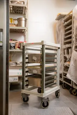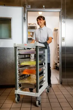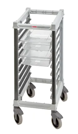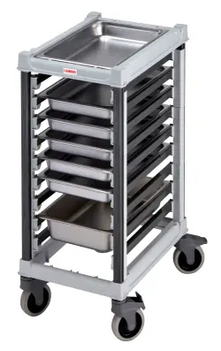 Kantinvagnen är designad för Gastronorm GN 1/1-kantiner och erbjuder maximal flexibilitet med breda 3” (7,6 cm) skenavstånd som gör hanteringen enkel. Skenorna klarar kantiner direkt från ugnen upp till 200 °C och rymmer djup från 20 mm till 200 mm. För extra stabilitet är varje skena utrustad med pan stops som håller kantinerna på plats.Med en robust topp som skyddar innehållet, lättmanövrerade hjul med total låsning samt utbytbara delar blir denna kantinvagn en långsiktig investering. Alla komponenter är NSF-certifierade och helt resistenta mot syror och starka rengöringsmedel. Dessutom omfattas vagnen av livstidsgaranti mot rost och korrosion.