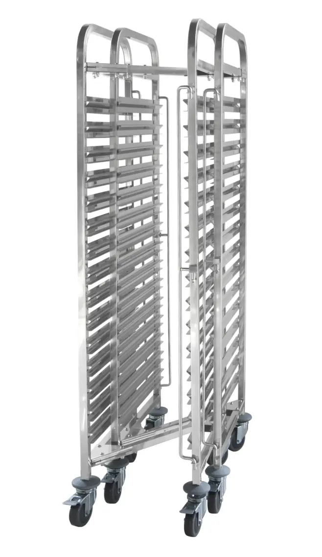 För att spara utrymme under lagring kan vagnarna skjutas in i varandra. GN 1/1 med 15 lager. Facklås på vardera sida. Utrustad med fyra hjul, varav två har bromsar. Flatpack leverans, montering krävs. Rostfritt stål.