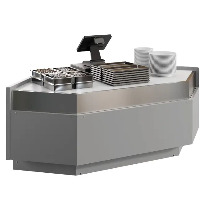 Design för traditionella serveringsskåp för kylda produkter och sallader för självbetjäning.