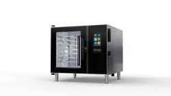 Modellen 6-1/1 GN erbjuder en kombination av en energieffektiv boiler och ett ånginjektionssystem. Tillsammans med smarta sensorer och integrerade dränerings- och inloppssystem ger ugnen snabb, effektiv och säker ångmättnad med hög densitet – perfekt för intensiv ångproduktion. Produktiviteten kan till och med maximeras med 17% eftersom ugnen har en kapacitet på 7 stick. Konstruktionen med 2 dörrar sparar tid och minskar risken för kontaminering. Dessutom fungerar den som ett utmärkt blickfång för att provocera fram impulsköp. Ångproduktionen och det automatiska rengöringssystemet styrs för att använda ett minimum av energi och vatten utan att kompromissa med resultaten.