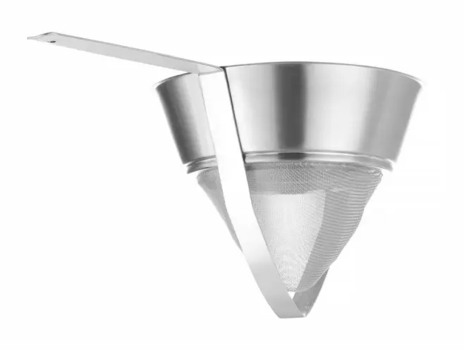 Helt tillverkad av AISI 201 satinerat rostfritt stål. Mycket fin mesh, förstärkt. Platt handtag med hål, förstärkt. Försedd med ett extra stödhandtag. Vändkant. Kan diskas i diskmaskin.