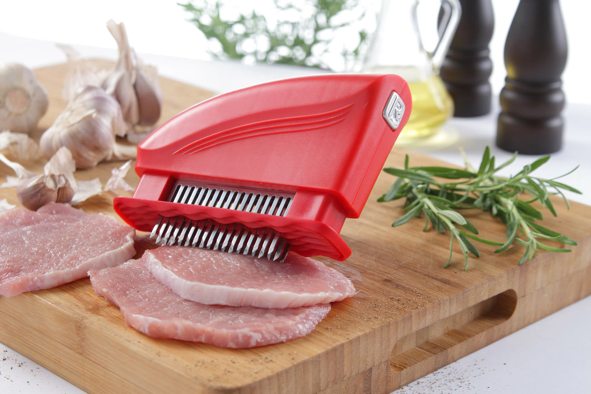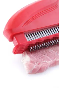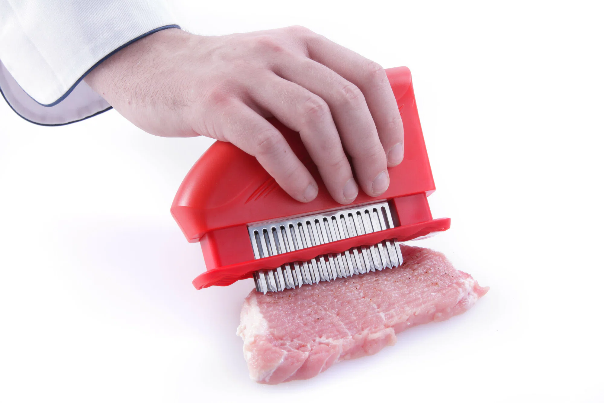 Modernt och effektivt verktyg för köttförbättring, de mellanliggande vertikala bladen minskar längden på köttfibrerna. Mörar köttet perfekt genom att mjukna vävnaden och fläta köttet samtidigt. Marineringstiden kan minskas med upp till 25%, eftersom köttets yta signifikant ökat. Under stekning tillåter den subtila perforeringen såser som hälls över köttet att ta sig in. Lättare användning och ett bättre resultat. ABS plast. Kan diskas i diskmaskin. Rostfritt stål 18/8.