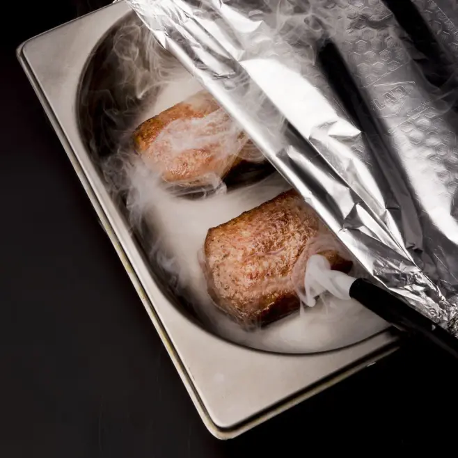 Kupol i borosilikatglas (spricktåligt) med silikonventil för rökpistolens munstycke. Skapa spekatakulära presentataioner framför gästen.