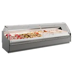 Fjärrkylt vitrin med böjt glas för assisterad service.