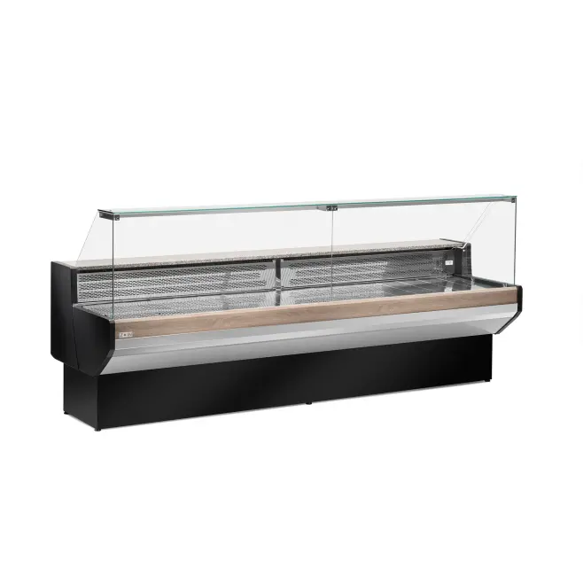 Komplett med LED-ljus och kylförvaring under den rostfria displayen.