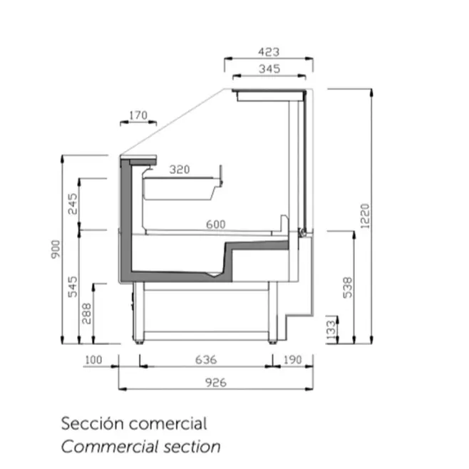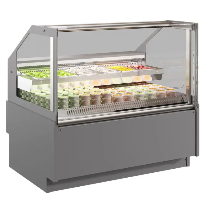 Design för traditionella serveringsskåp för kylda produkter och sallader för självbetjäning.