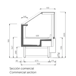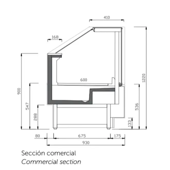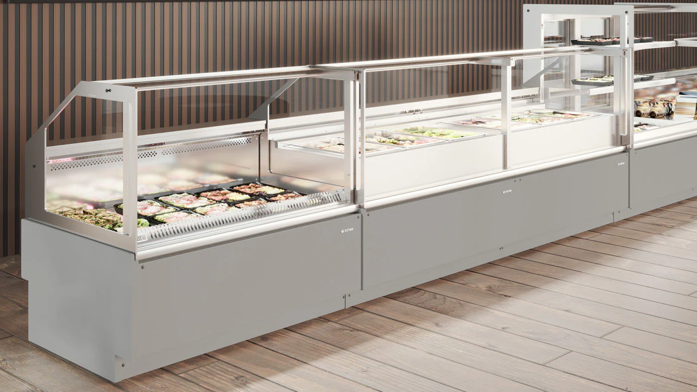 Design för traditionella serveringsskåp för kylda produkter och sallader för självbetjäning.