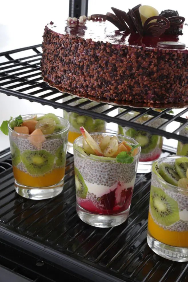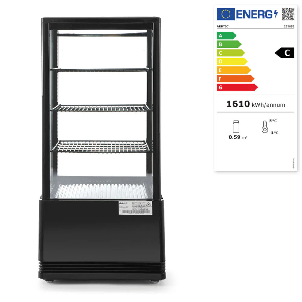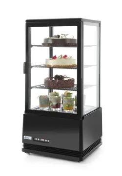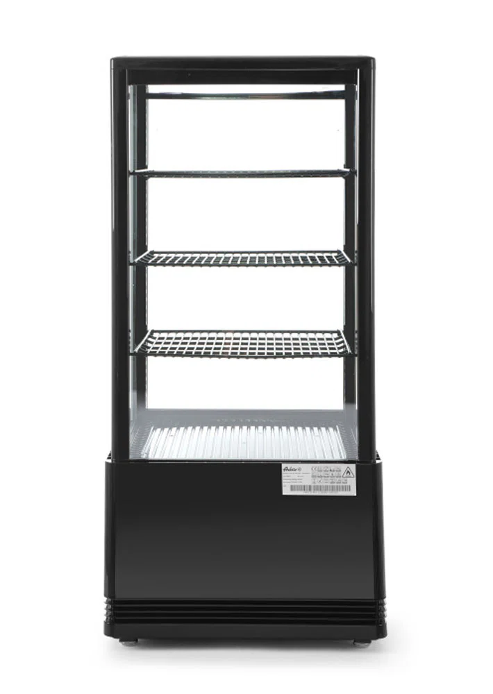 Housing made of coated stainless steel fitted with double glazing. Forced air cooling with auto-defrost, compressor placed underneath the chamber. Air duct outside of the glass blows air over the glass to remove and prevent condensation. Durable PVC coated shelves, adjustable in height. With bright LED lighting in the ceiling. Digital temperature controller and display. Temperature range: 2 to 6°C. Climate class: 4 Refrigerant: R600a.
