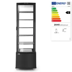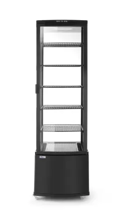 Housing made of coated stainless steel fitted with double glazing. Forced air cooling with auto-defrost, compressor placed underneath the chamber. Air duct outside of the glass blows air over the glass to remove and prevent condensation. Durable PVC coated shelves, adjustable in height. With bright LED lighting in the ceiling. Digital temperature controller and display. Temperature range: 2 to 6°C. Climate class: 4 Refrigerant: R600a.