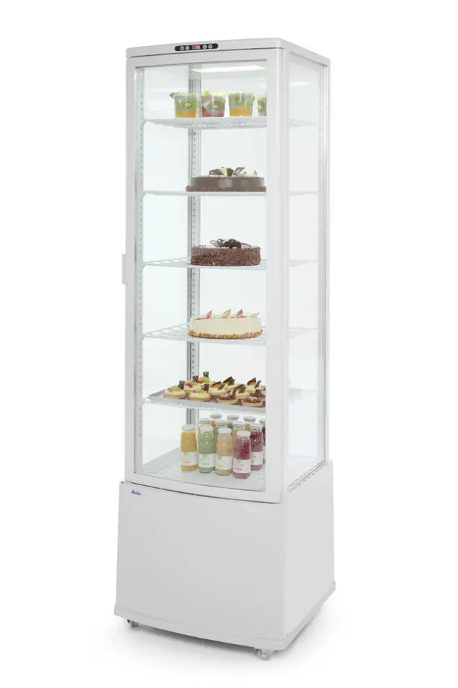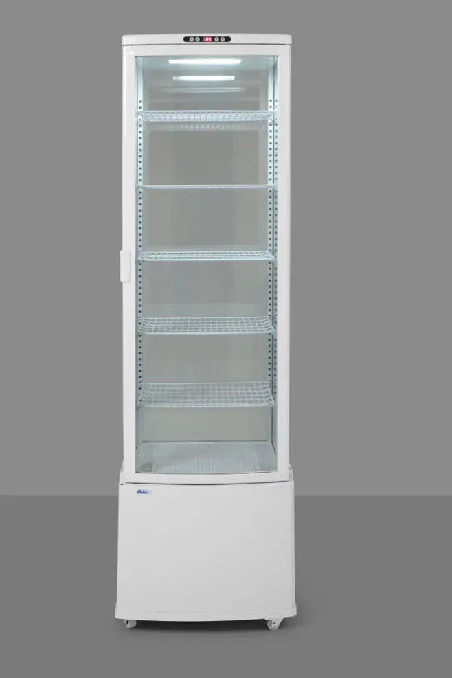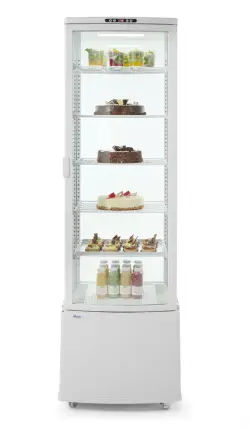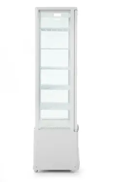 Housing made of coated stainless steel fitted with double glazing. Forced air cooling with auto-defrost, compressor placed underneath the chamber. Air duct outside of the glass blows air over the glass to remove and prevent condensation. Durable PVC coated shelves, adjustable in height. With bright LED lighting in the ceiling. Digital temperature controller and display. Temperature range: 2 to 6°C. Climate class: 4 Refrigerant: R600a.