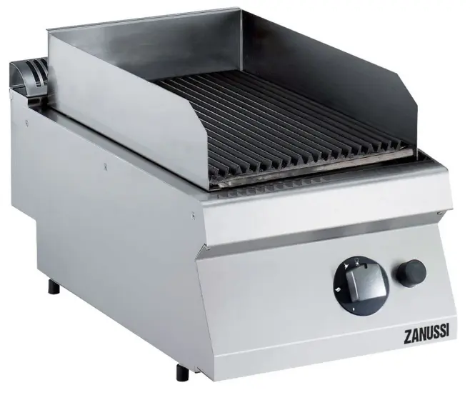Lavastensgrill, gas. Bänkmodell. 400mm. Gasbrännare (7kW). Gjutjärnsgaller. Gasoldysor bifogas.