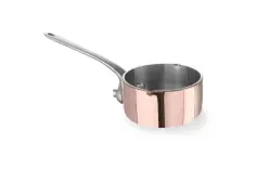 Made of 2.5 mm thick 3-ply material, copper/aluminium/stainless steel. Handle attached by rivets.