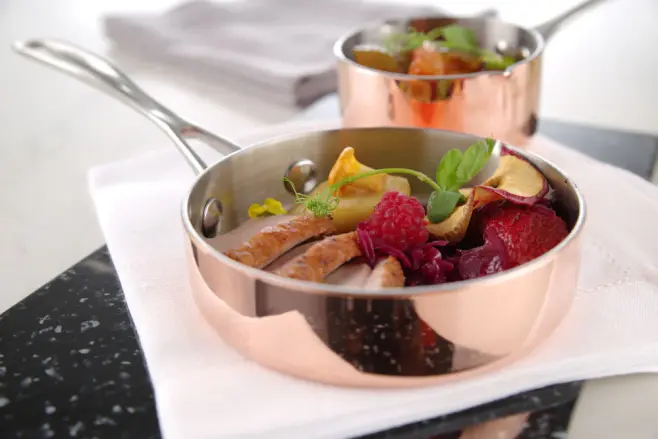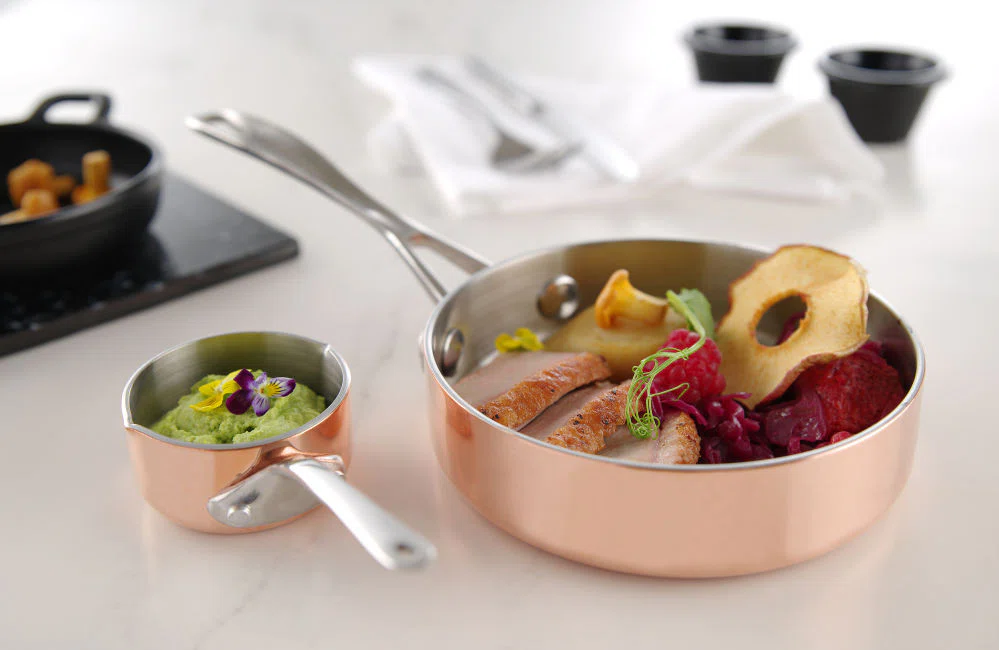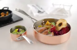 Made of 2.5 mm thick 3-ply material, copper/aluminium/stainless steel. Handle attached by rivets.