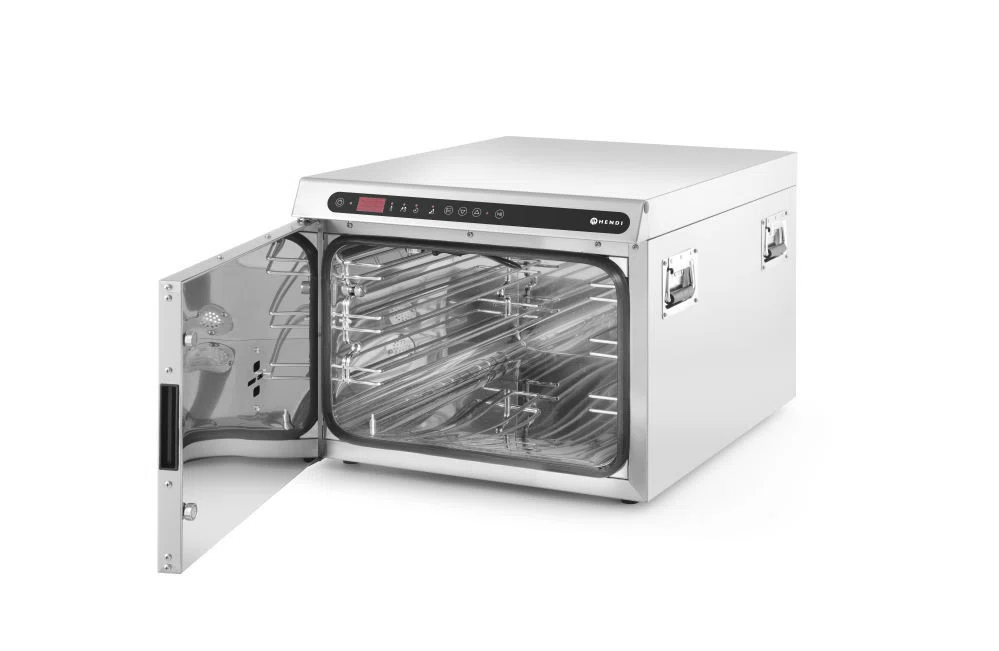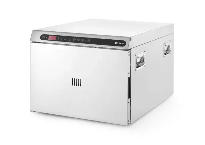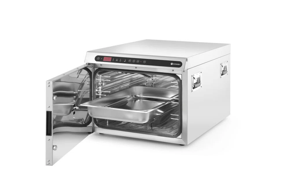 Utformad för långsam tillagning eller regenerering av livsmedel med hjälp av en mycket noggrant inställd och kontrollerad process. Med en separat justerbar sond för kärntemperatur. Infällda handtag i sidorna. Dörrtätning som är lätt att rengöra. Ugnskammaren är uppvärmd på 4 sidor, vilket ger en jämn fördelning av värmen i hela kammaren.