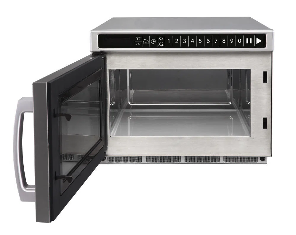 Kammarens hölje och interiör av rostfritt stål. Kammare försedd med ett keramiskt golv. Lättläst touchkontrollpanel med tryckknappar och digital display som visar tid och effekt. Nedre och övre roterande mikrovågsantenner för jämn energifördelning, inga roterande delar i kammaren. Inbyggt luft- och fettfilter för att skydda mot yttre faktorer. Ett speciellt system som påminner dig om att rengöra filtret. Dörr med stort fönster för att observera processer i den upplysta mikrovågskammaren. Tät spärrstängning; enkel öppning – ingen låsmekanism. Kammarinredning: – mått 330x310x(H)175, kapacitet 18 l. – lätt att rengöra. – ingen brytning av tallrikar tack vare lämpligt rundade kanter. – keramiskt golv. Multifunktionell användning: – avfrostning. – 10 standardprogram. – 10 effektnivåer. – ladda upp program via USB-porten, – möjlighet att spara upp till 100 program, inklusive upp till 20 anpassade flerstegsprogram. – automatisk tidsomvandling för dubbla eller trippelportioner. – slutet av programmet signaleras av ett larm. Möjlighet att ändra ljudet eller stänga av det helt. Mikrovågseffekt: 3000 W. Lämplig för runda (upp till 300 mm) och rektangulära tallrikar. Maximal engångstid: 60 minuter. Försedd med jordad kontakt. Levereras med ett USB-kort, mjukvara medföljer. Vikt: 31,8 kg.