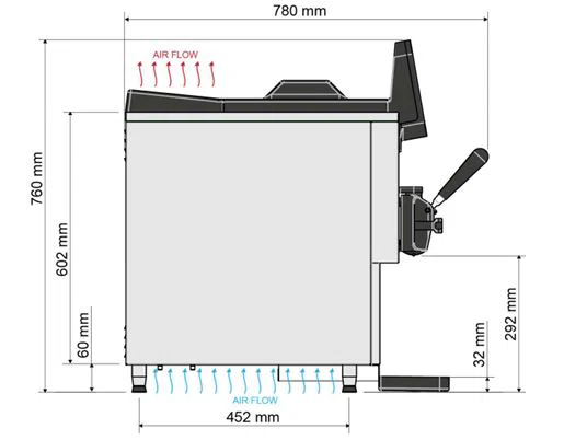 Maskinen drivs med 230V 1-fas och är luftkyld, vilket gör den enkel att integrera i befintliga kök. Den använder dessutom naturligt köldmedium (R290) för energieffektiv och miljövänlig drift.