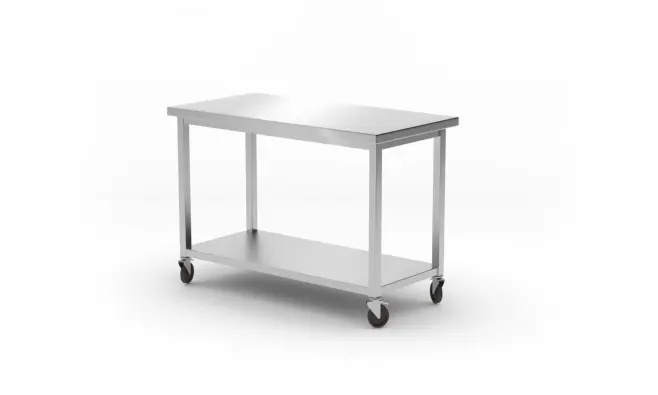 Tillverkad av AISI 430 rostfritt stål. Fötter av 40×40 mm profiler. Bänkskiva fylld underifrån med vattentät laminerad skiva som förstärker och ljudisolerar föremålet. Ståltrådshylla monterad på 200 mm, ej justerbar. Ungefärlig maxbelastning per bänkskiva och per hylla – 70 kg/m². Bänkskiva utan backsplash gör att användaren kan använda bordet oavsett var de står. 4 lågljud, svängbara hjul Ø125 mm, varav två är utrustade med broms