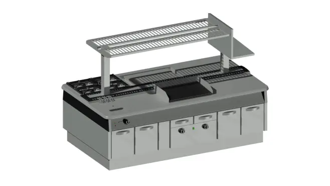KORE Monoblock 700 bestående av, på ena sidan, fritös och grill samt neutral arbetsyta, på andra sidan gasspis med 4 brännare och stekhäll samt även där neutral arbetsyta. Monoblocken är utrustad med integrerad gallerhylla och hylla för serviceugn - förslagsvis iKore XS (2/3GN). Undertill är en kombination av kyllådor och neutral förvaring.