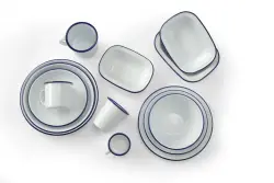 Emaljerad mugg i vitt med blå kant från Hendi som rymmer 520 ml. Emaljerad servis har gjort comeback. Vitlackerat stål med fin blå kant. Emalj av hög kvalitet. Nötningsbeständig. Muggen tål diskmaskin.