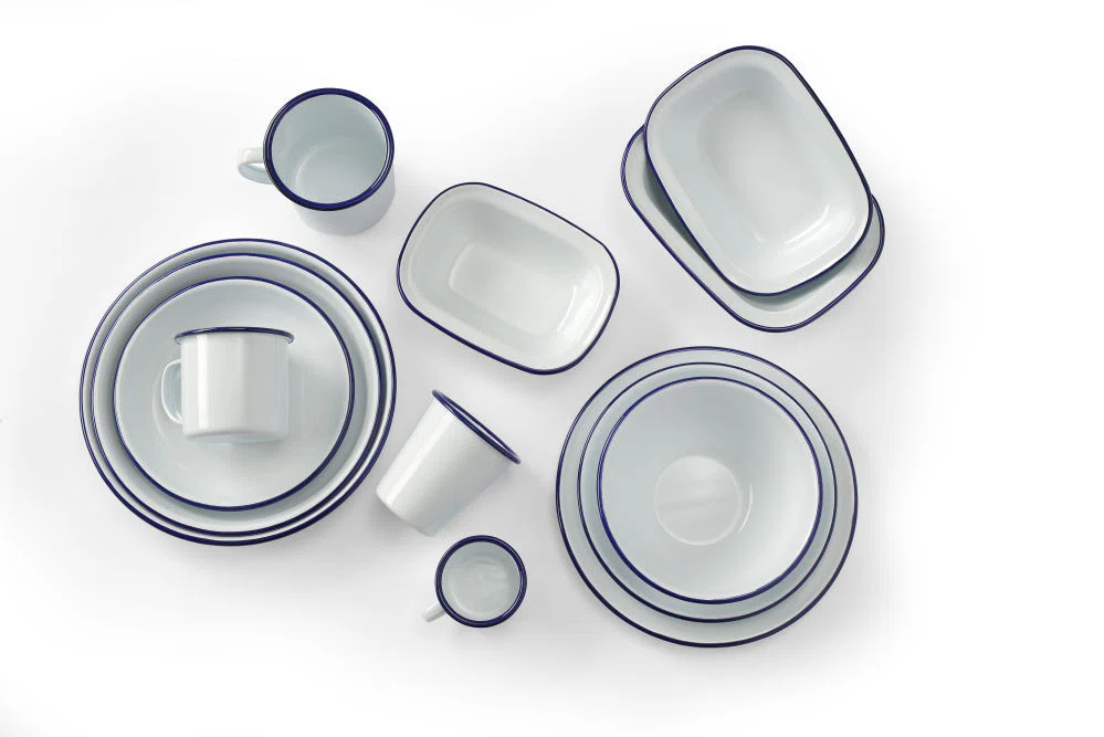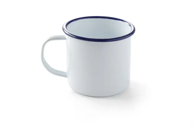 Emaljerad mugg från Hendi. Rymmer 360 ml. Emaljerad servis har gjort comeback. Vitlackerat stål med fin blå kant. Emalj av hög kvalitet. Nötningsbeständig och tål diskmaskin.