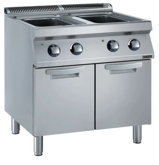 Pastakokare (800mm) i golvmodell med 2 bassänger (2×24,5L), speciellt konstruerad för snabb uppkokning av pasta, men lämpar sig även för kokning av andra livsmedel, såsom grönsaker eller potatis. Anpassad för anslutning underifrån eller bakifrån, och för montering mot enheter i Zanussi 700-serie.