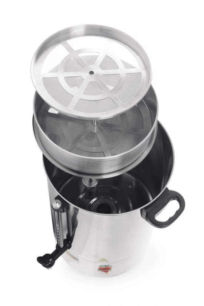Single walled stainless steel body. Filter pan has built-in filter for coarsely ground coffee, filter paper not needed. The percolator keeps the coffee at serving temperature after brewing. With graduated glass, non-drip tap and fitted with automatic reset. The indicator light signals the end of the brewing process and if descaling is needed.