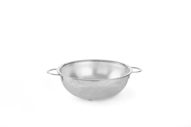 Perforerat durkslag med avställningsbas i rostfritt stål och två handtag. Tål diskmaskin.