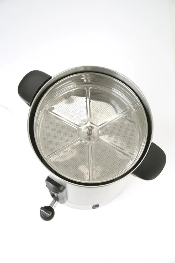 Designad med dina gäster i åtanke av den kända holländska designern Robert Bronwasser. Den unika designen och uppmärksamheten på detaljer gör denna apparat till ett blickfång på alla bufféer. Enkelväggig kropp i rostfritt stål, med snygga polypropenhandtag och lock. Unik droppfri design med integrerat graderat glas. Droppbrickan är magnetisk, den kan tas bort utan att lyftas eller spills. Filterpanna har inbyggt filter för grovmalet kaffe, filterpapper behövs ej. Perkolatorn håller kaffet vid serveringstemperatur efter bryggning. Indikatorlampan signalerar slutet på bryggprocessen och om avkalkning behövs.