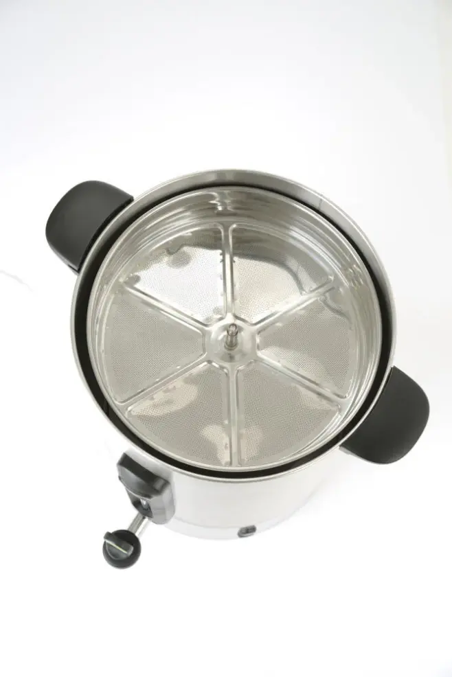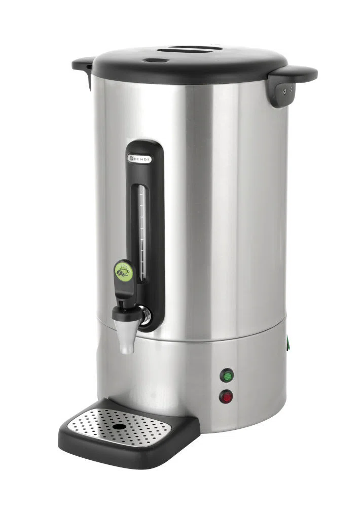 Perkulator - Design av Bronwasser, HENDI, 7L, 230V/1650W, mått: 307x330x(H)450mm. Enkelväggig kropp i rostfritt stål, med snygga polypropenhandtag och lock. Unik droppfri design med integrerad graderat glas. Dropbrickan är magnetisk, den kan tas bort utan att lyftas eller spills. Filterpanna har inbyggt filter för grovmalet kaffe, filterpapper behövs ej. Perkolatorn håller kaffet vid serveringstemperatur efter bryggning.