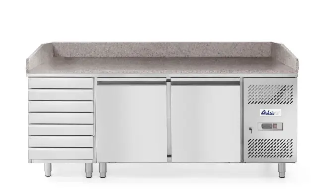 Inner and outer housing are made of high-quality stainless steel, with granite worktop. Doors fitted with comfortable handles. Forced air cooling with auto defrost, compressor placed underneath the chamber. With adjustable shelving, fits containers up to GN 1/1. Digital display and electronic thermostat. Wittidh 4 adjustable plastic non-slip feet. Climate class: SN-T. Coolant: R600a. All models delivered without GN containers.