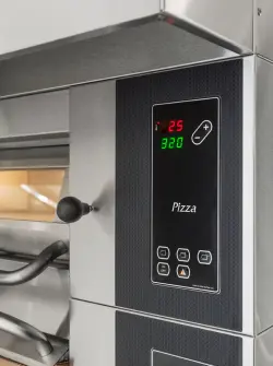 Pizzaugnens dubbla halogenbelysning och keramiska glas i luckorna ger en god överblick av pizzorna under gräddningen. Den lättanvända panelen med turbostart, veckotimer och effektvakt gör bakningen mycket enkel och imkåpan underlättar för bagaren vid öppning av luckan, då den effektivt leder bort ånga.