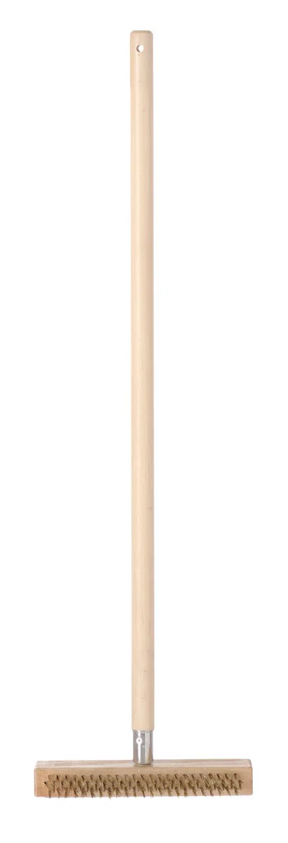Pizzaborste med mässingtråd och trähandtag. Stålskrapa. Från Hendi.
