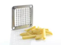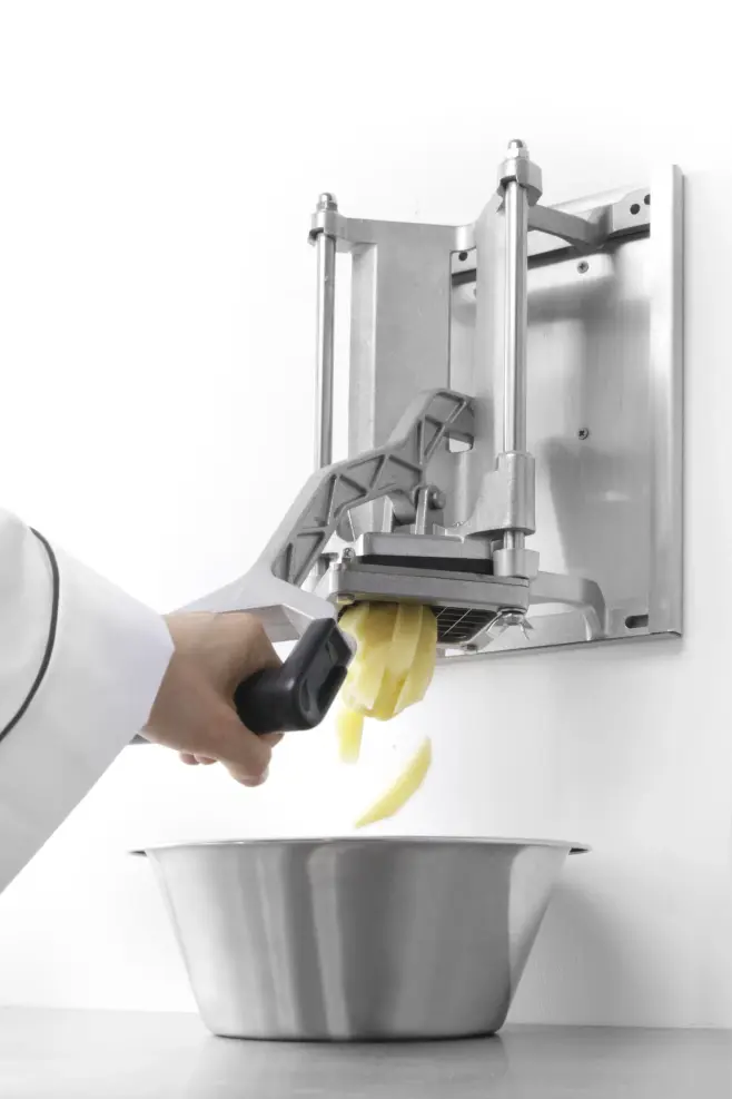 Knivar av rostfritt stål. Levereras med 4 blad: 6, 9 och 13 mm, samt en kniv för 8 delar. Monterbar till arbetsbord eller vägg. Handtag täckt av plast för lättare pressning. Rostfritt stål monteringsplatta möjliggör enkelt avlägsnande och rengöring. Med gummifötter för stabilitet. Gjuten aluminium. Ej diskmaskin säker. Rostfritt stål.