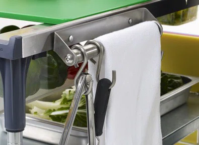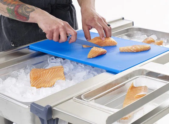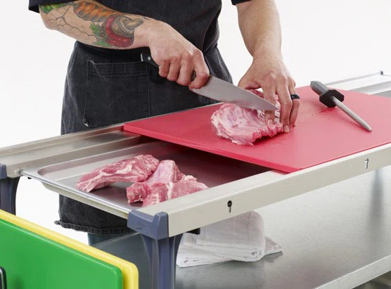 PrepMate Mulit-Rail designen håller en standard 45x60cm skärbräda ovanför standard kantiner.