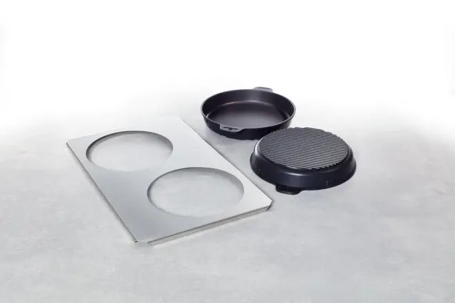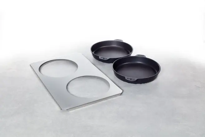 Med stek- och bakpannan kan du tillaga mängder av klassiska långpannerätter, som tortilla, paella, rösti, paj och ugnspannkaka, men även små pizzor, kakor osv., på bara några få minuter. Den vågiga botten säkrar en jämn bryning och antistickbeläggningen TriLax förhindrar att produkterna bränner fast. Bärplåten gör att du enkelt och säkert kan hantera stora beskickningsmängder. Stek- och bakpannan finns i två storlekar (16 cm och 25 cm i diameter).