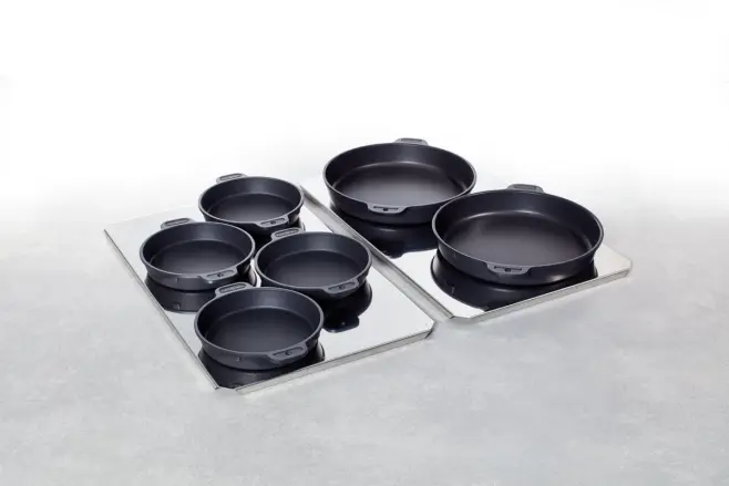 Med stek- och bakpannan kan du tillaga mängder av klassiska långpannerätter, som tortilla, paella, rösti, paj och ugnspannkaka, men även små pizzor, kakor osv., på bara några få minuter. Den vågiga botten säkrar en jämn bryning och antistickbeläggningen TriLax förhindrar att produkterna bränner fast. Bärplåten gör att du enkelt och säkert kan hantera stora beskickningsmängder. Stek- och bakpannan finns i två storlekar (16 cm och 25 cm i diameter).