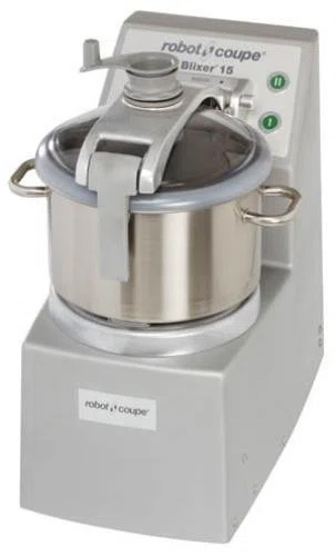 2 maskiner i en, kraftfull mixer och snabbhack till restaurang. Induktionsmotor, motorblock i metall med pulsfunktion, variabelt varvtal: 300-3500 varv/min, 1-fas. Blixerkärl på 15 liter och en räffeltandad kniv (3-bladig) som kan mala, hacka och knåda.