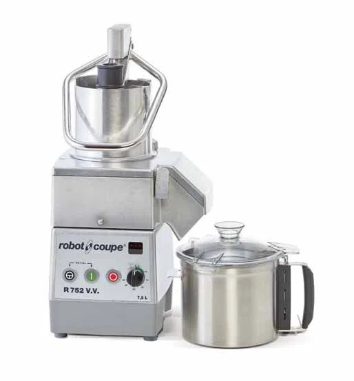 Induktionsmotor, motorblock i metall och pulsfunktion. Alla delar är löstagbara för enkel rengöring. Snabbhack: Behållare 7,5 liter i rostfritt stål. Slät kniv ingår. Grönsaksskärare: Löstagbar grönsaksskärartillsats. Rund nedmatare 4,4 liter och tubmatare. Finns 50 olika skärverktyg som går att beställa separat. Varvtal: 750/1500 varv/min. 3-fas.