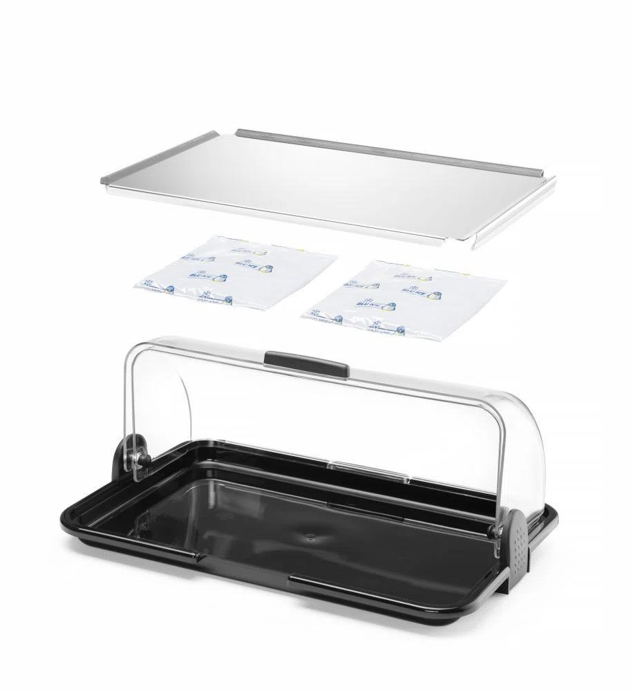 Tillverkad av polypropen med en insats i rostfritt stål. Transparent Rolltop-överdrag av polystyren. Bekväm tillgång till serverad mat från båda sidor av montern. Två funktioner: kyl- eller värmedisplay. Kyl-/värmeelement placerade under den rostfria brickan för att hålla temperaturen i facket. Lätt att städa. Designad och tillverkad till 100 % i Italien. Setet innehåller 2 gelinsatser för kylning eller uppvärmning. Kan diskas i diskmaskin.