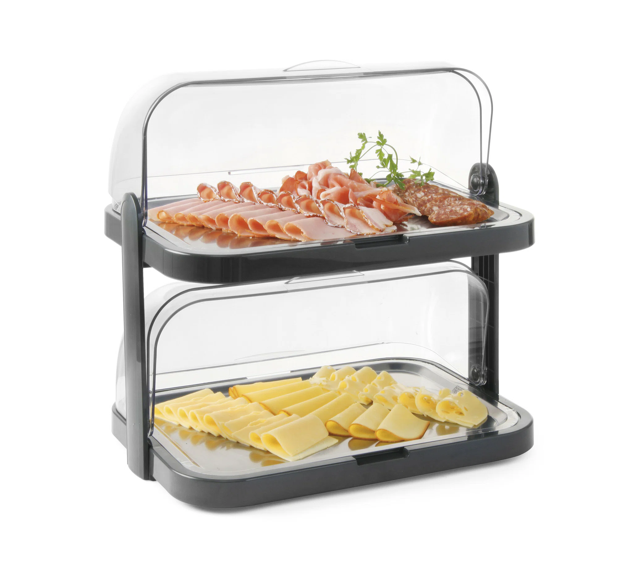 Roll topdisplay med kylbricka, dubbeldäckare. Inkluderar två roll top,två brickor i rostfritt stål och fyra kylklampar. 440x320xH205mm.