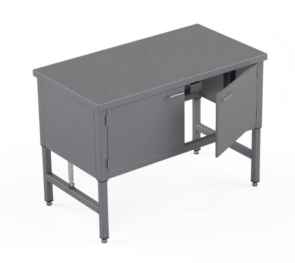 Rostfri höj/sänkbar arbetsbänk med skåp och sektionshylla – måttbeställd