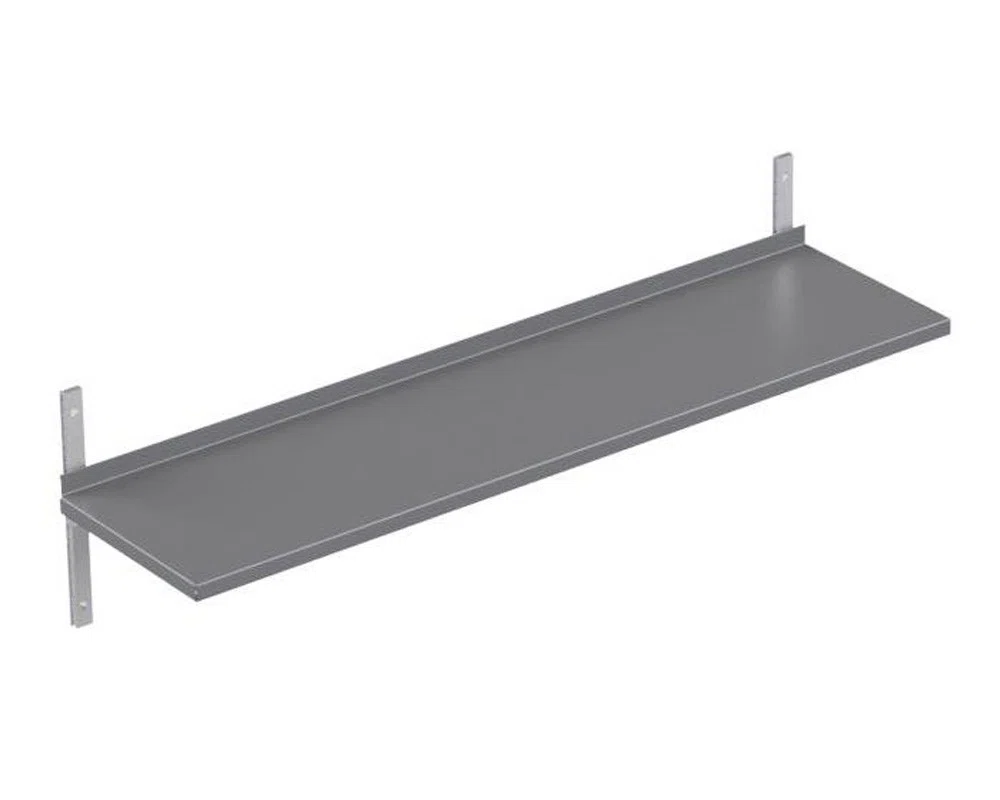Hyllorna och vägghyllorna är robusta, stabila och svetsade. Allt tillverkas med förstärkningar i rostfritt på undersidan och levereras komplett med skenor och konsoller.