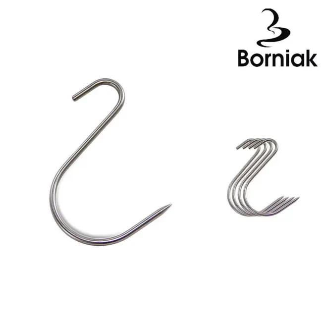 Tillbehör till Borniak rökskåp. Assymetriska S-krokar som passar utmärkt till kött. Den assymetriska formen gör att röken blir mer effektiv eftersom de inte tar lika mycket plats. I stora änden hängs köttet. I detta paket ingår 5 st krokar. Gjorda i rostfritt stål som är syrafast.