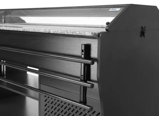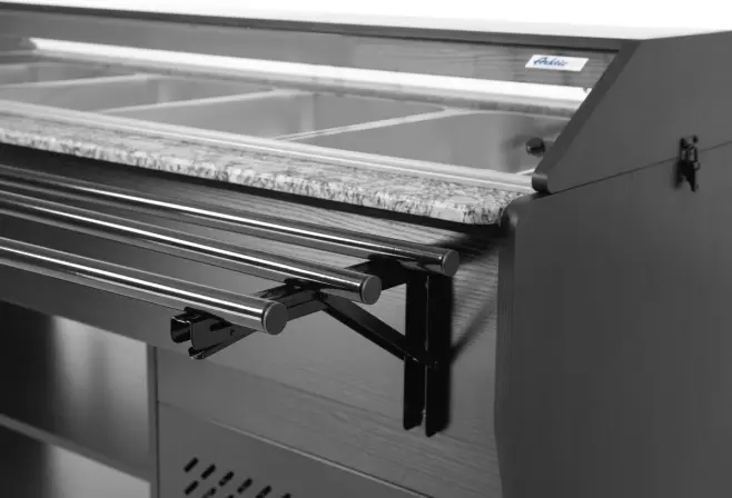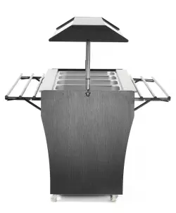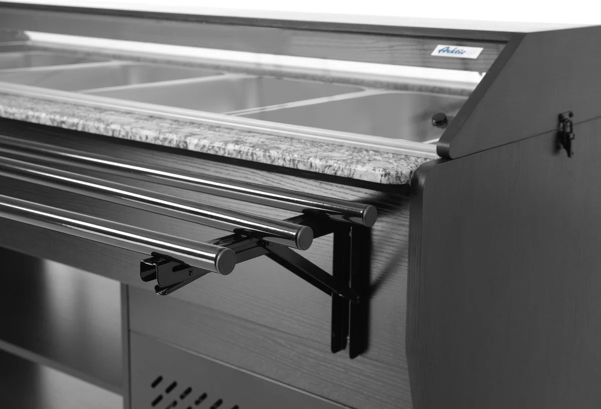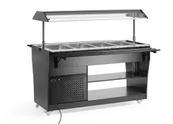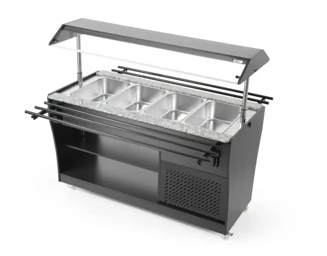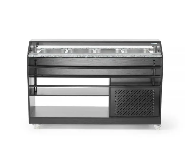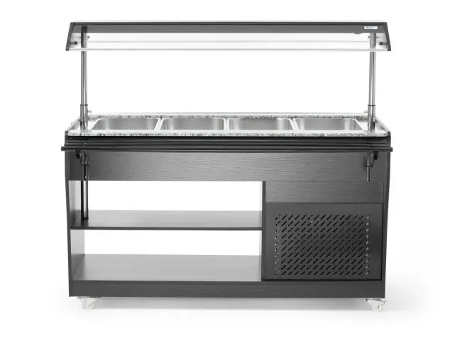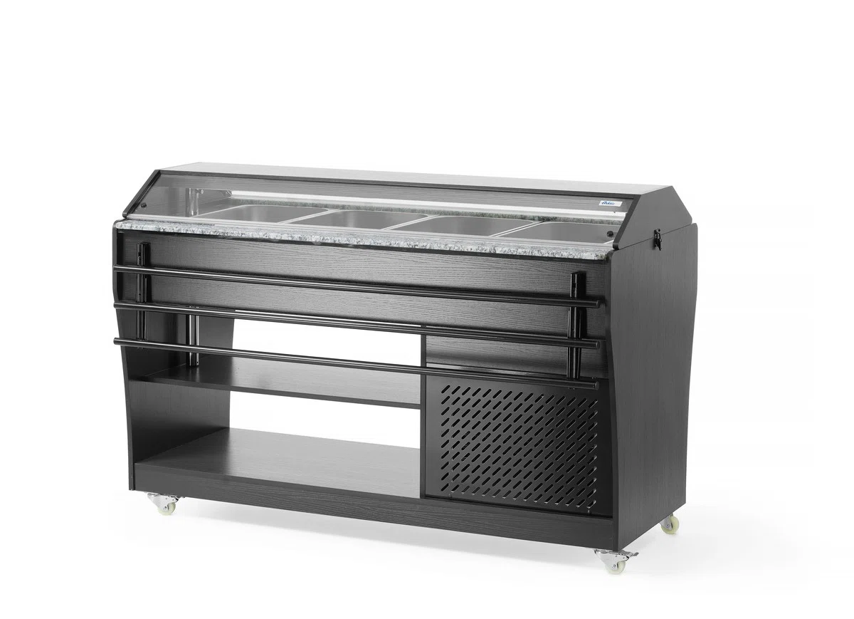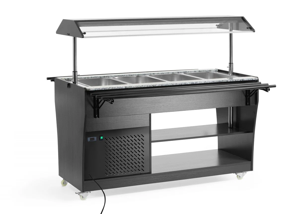 Arktic Salladsbuffé har plats för 4 GN 1/1-behållare, som ingår i setet. Buffén är utrustad med belysning i taket, har 2 hyllor undertill för förvaring av tallrikar och bestick och är lätt att flytta tack vare 4 hjul. Denna buffé är den perfekta lösningen för självbetjäning eller evenemang, eftersom den har en hylla för brickor på båda sidor och ser till att maten hålls perfekt sval.
