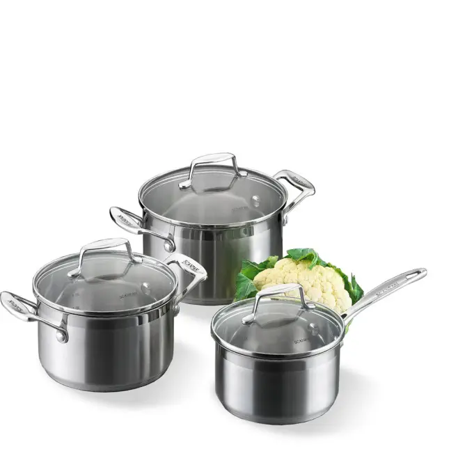 Ett komplett grytset som består av en liten kastrull, en basgryta och en stor gryta. Lock i härdat glas ingår.