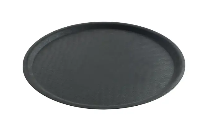 Svart glasfiberförstärkt bricka i polyester. Idealisk för tunga lyft. Stötsäker och glidfri gummiyta, effektiv både våt och torr. Tål diskmaskin. Temperaturbeständig från -10 ° till 100 ° C. Ø400mm.